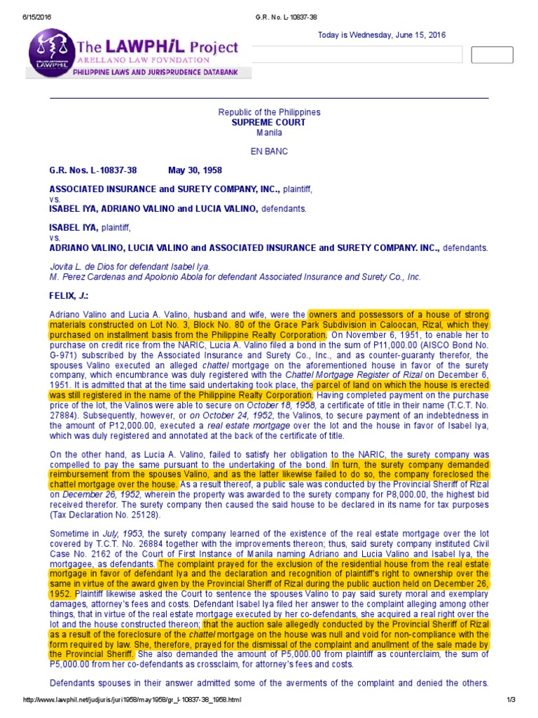 spouses Valino executed an alleged chattel mortgage on the aforementioned house in favor of the surety