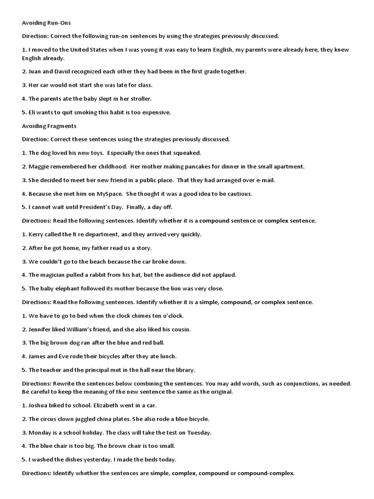 Directions: Identify whether the sentences are simple, complex, compound or compound-complex.
