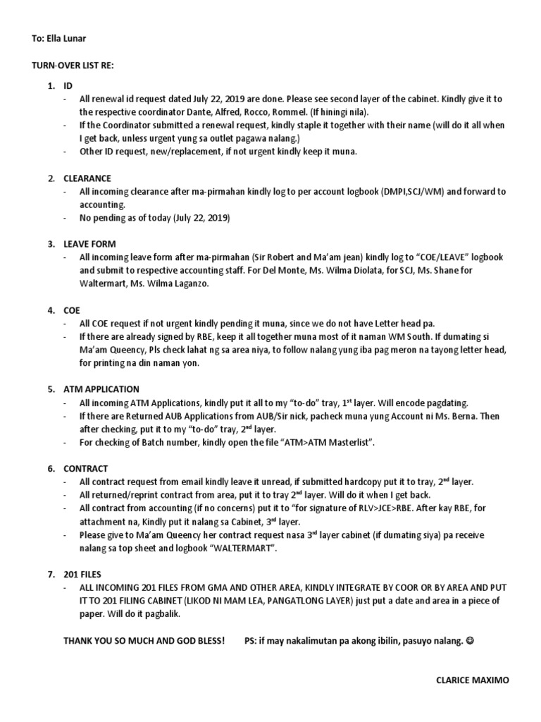 - Please give to Ma’am Queency her contract request nasa 3rd layer cabinet (if dumating siya) pa receive
