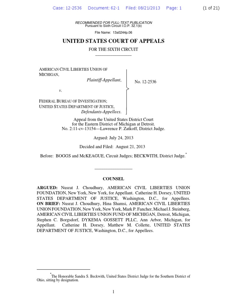 Nusrat J. Choudhury, Hina Shamsi, AMERICAN CIVIL LIBERTIESUNION FOUNDATION, New York, New York, Mark P. Fancher, Michael J. Steinberg,AMERICAN CIVIL LIBERTIES UNION FUND OF MICHIGAN, Detroit, Michigan,Stephen C. Borgsdorf, DYKEMA GOSSETT PLLC, Ann Arbor, Michigan, for Appellant. Catherine H. Dorsey, Matthew M. Collette, UNITED STATESDEPARTMENT OF JUSTICE, Washington, D.C., for Appellees.