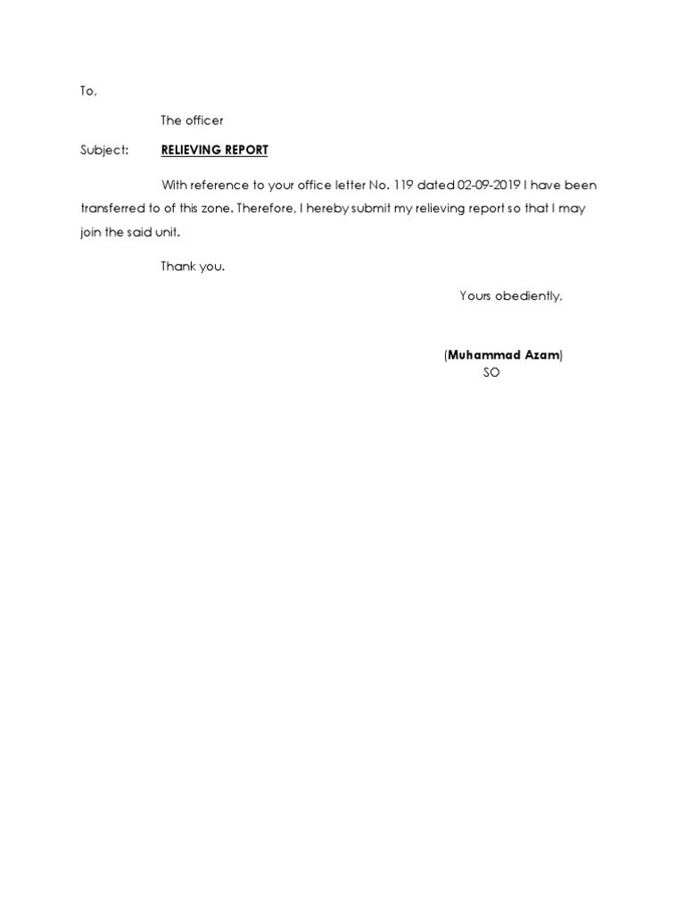transferred to of this zone. Therefore, I hereby submit my relieving report so that I may