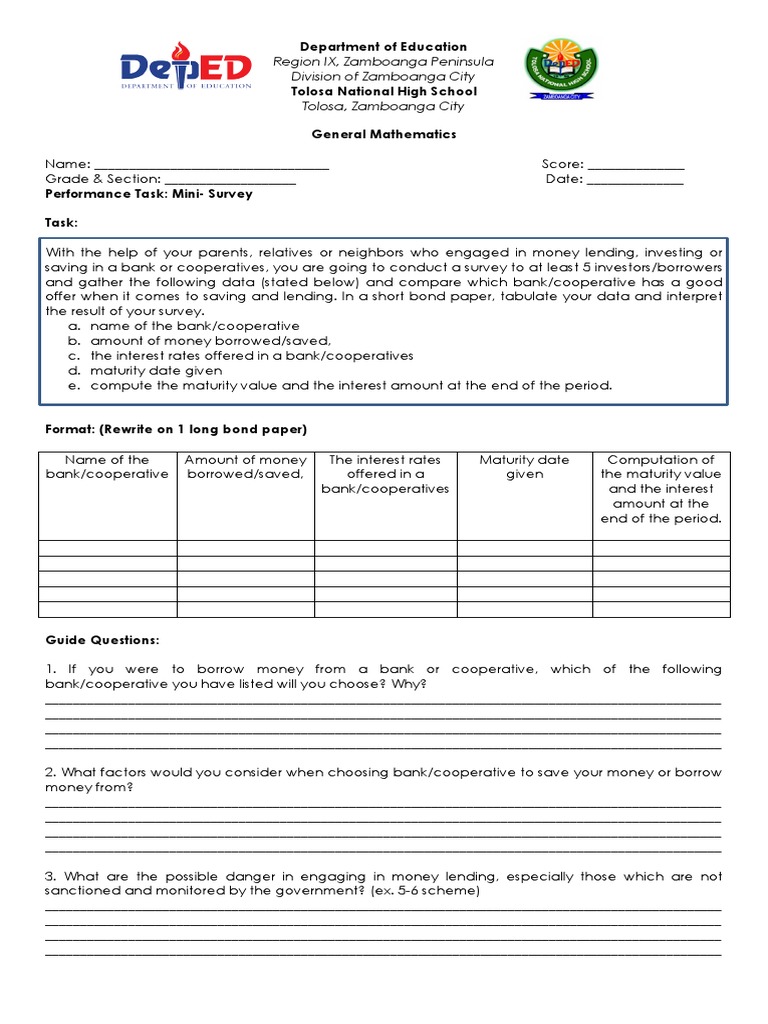 offer when it comes to saving and lending. In a short bond paper, tabulate your data and interpret