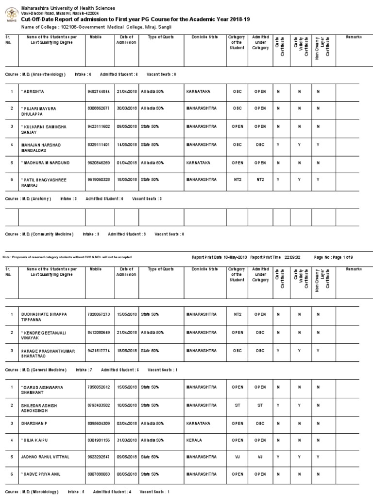 Cut-Off-Date Report of admission to First year PG Course for the Academic Year 2018-19