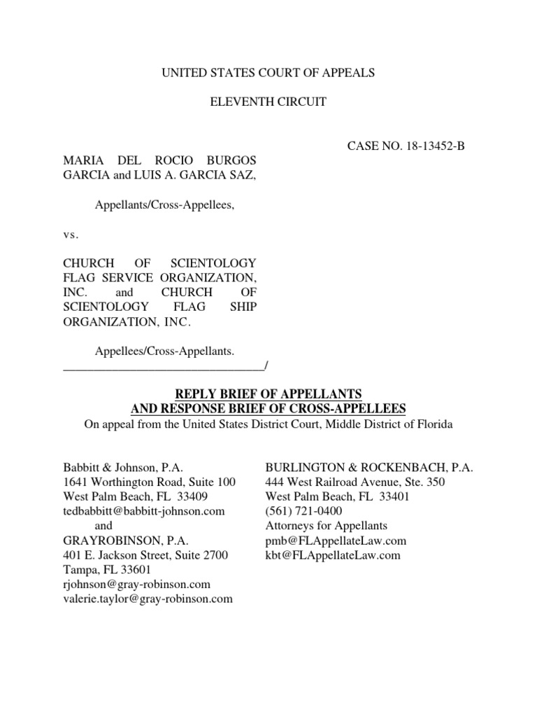 UNITED STATES COURT OF APPEALS ELEVENTH CIRCUIT CASE NO. 18-13452-B MARIA DEL ROCIO BURGOS GARCIA and LUIS A. GARCIA SAZ, Appellants/Cross-Appellees, vs. CHURCH OF SCIENTOLOGY FLAG SERVICE ORGANIZATION, INC. and CHURCH OF SCIENTOLOGY FLAG SHIP ORGANIZATION, INC. Appellees/Cross-Appellants. _________________________________/