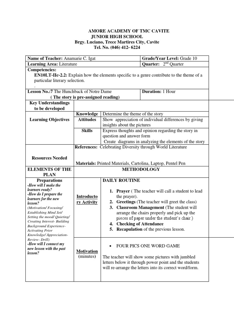 Name of Teacher: Anamarie C. Igat Grade/Year Level: Grade 10