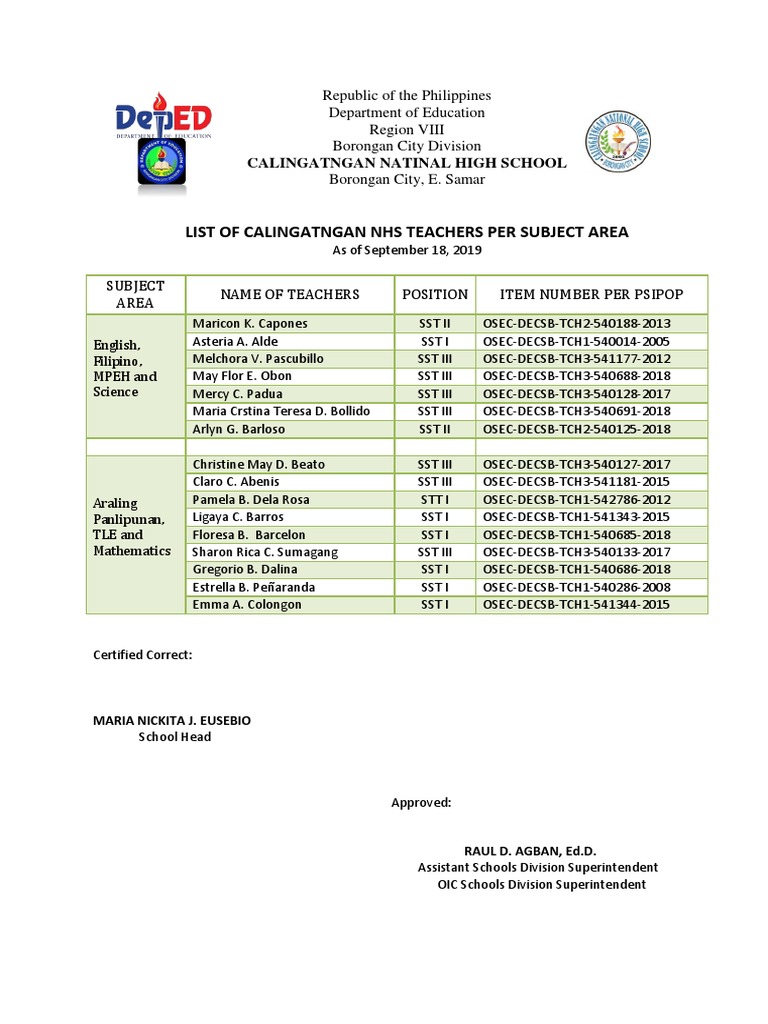 LIST OF CALINGATNGAN NHS TEACHERS PER SUBJECT AREA
