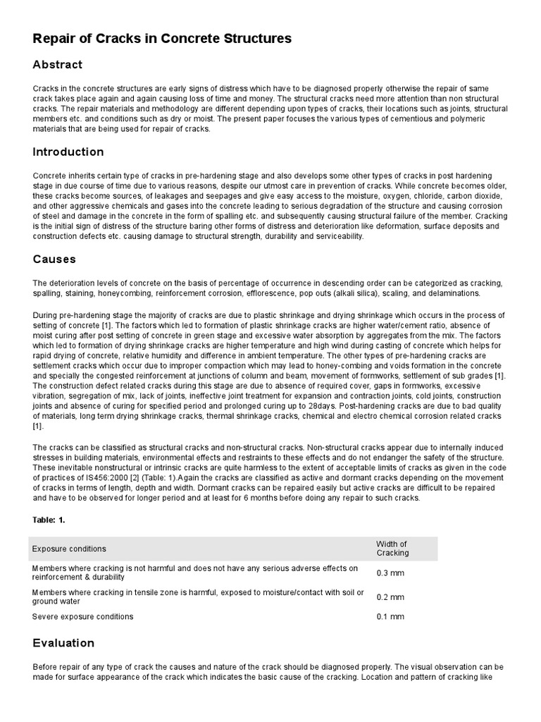 cracks. The repair materials and methodology are different depending upon types of cracks, their locations such as joints, structural