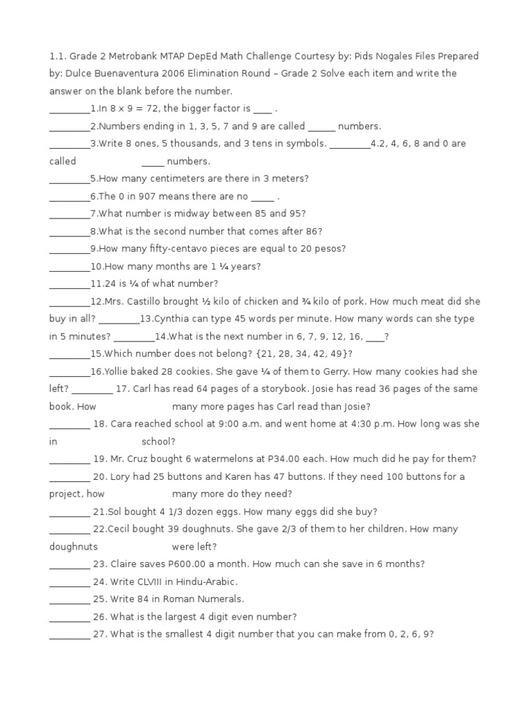 Grade 2 Metrobank MTAP DepEd Math Challenge Courtesy by: Pids Nogales Files Prepared