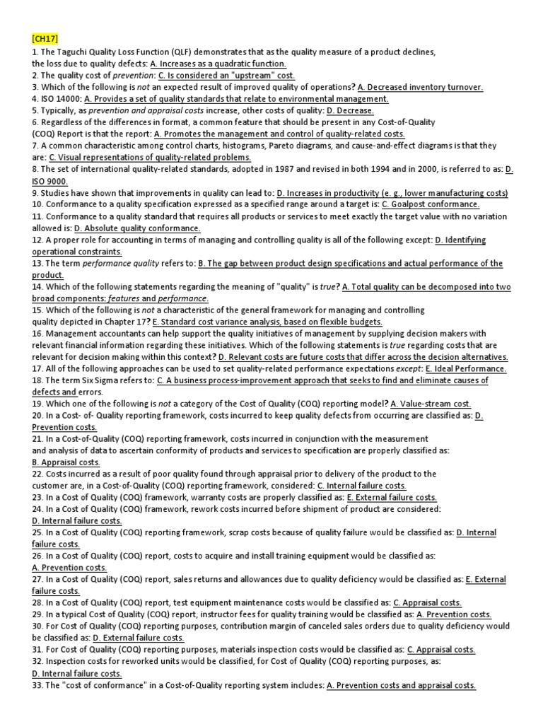 12. A proper role for accounting in terms of managing and controlling quality is all of the following except: D. Identifying