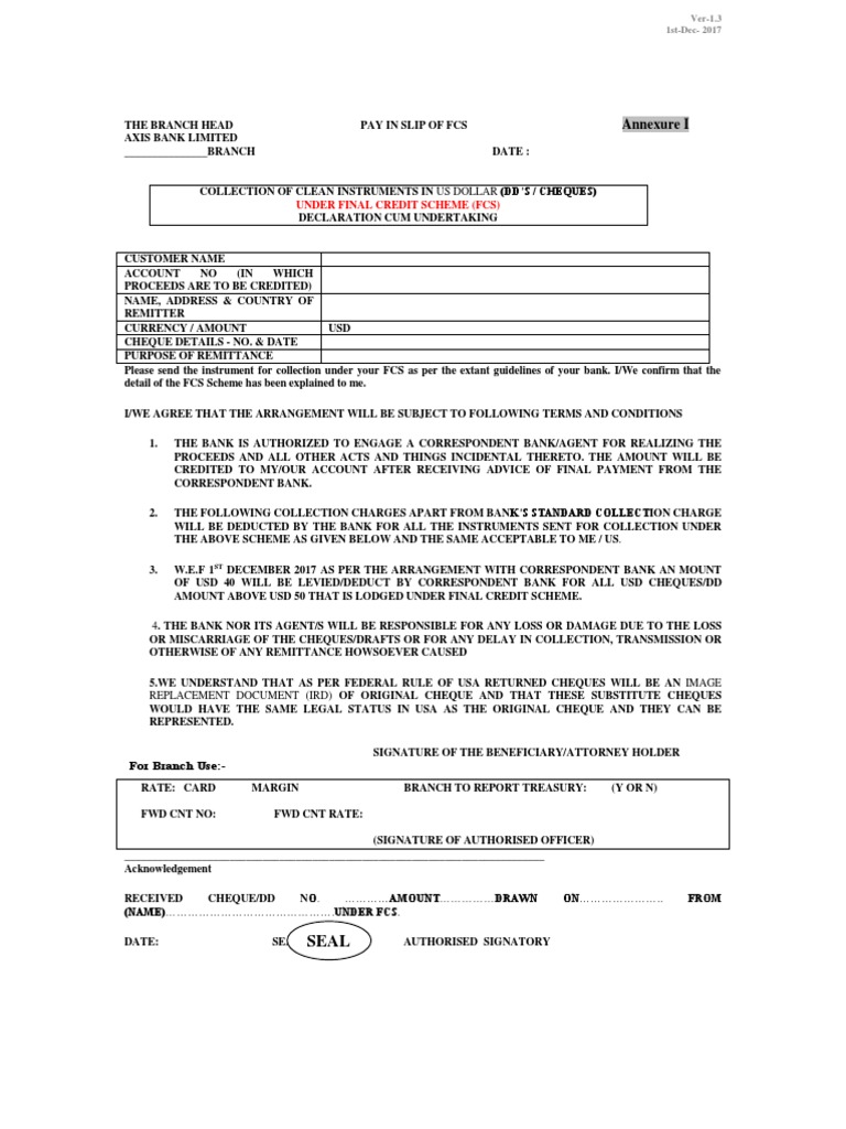 Please send the instrument for collection under your FCS as per the extant guidelines of your bank. I/We confirm that the