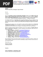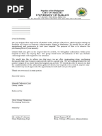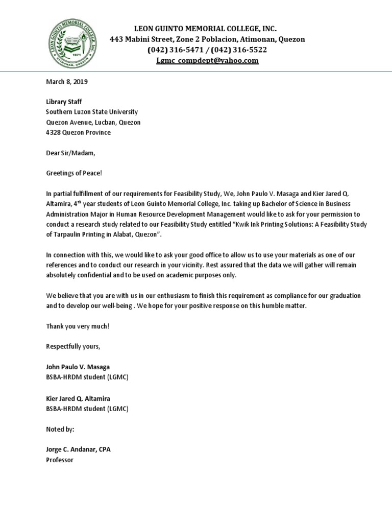 The letter requests permission from the Southern Luzon State University library to conduct research and use library materials as references for a feasibility study on a proposed tarpaulin printing business in Alabat, Quezon. The study is a graduation requirement for two fourth-year BSBA students from Leon Guinto Memorial College. They assure confidentiality and academic use of any data collected from the library.