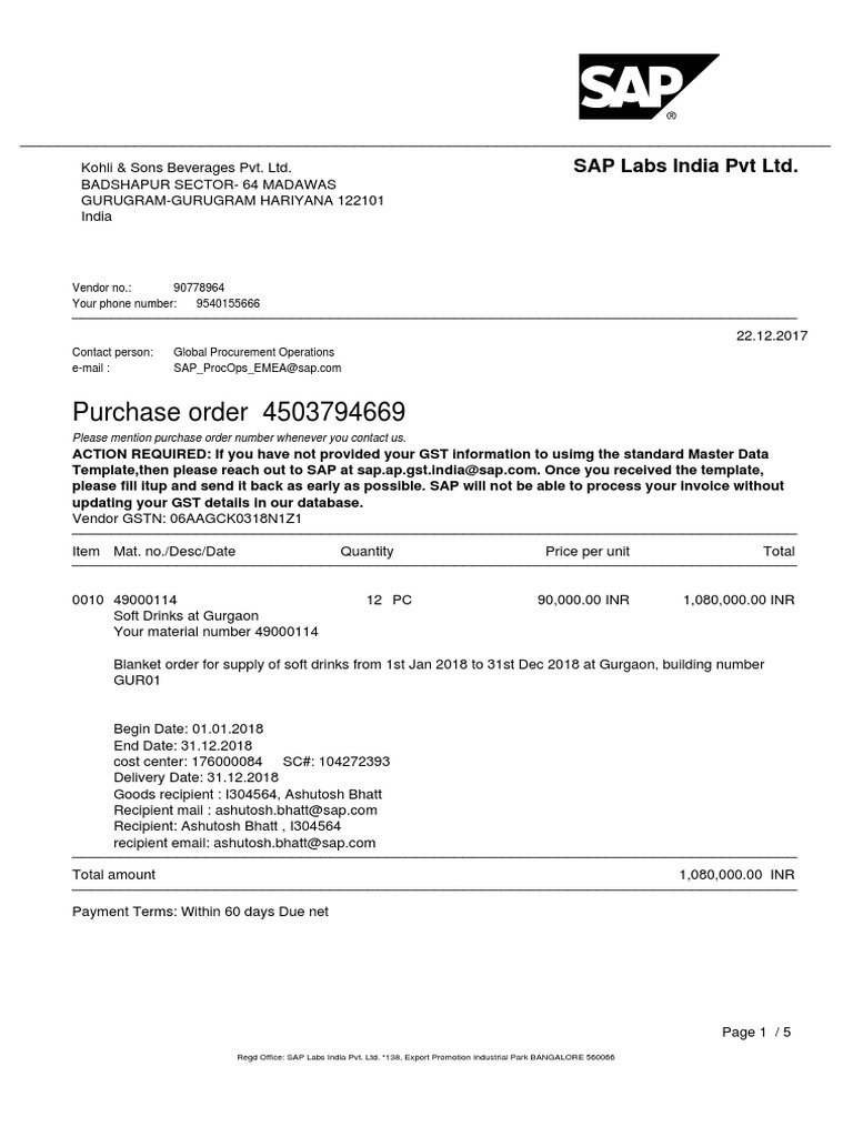 This purchase order is governed by SAP Labs India Pvt Ltd Purchasing Terms and Conditions. Copy of the