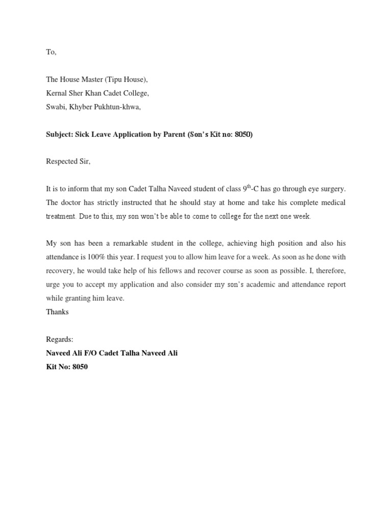 It is to inform that my son Cadet Talha Naveed student of class 9th-C has go through eye surgery.