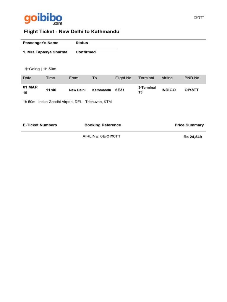 Flight Ticket - New Delhi to Kathmandu