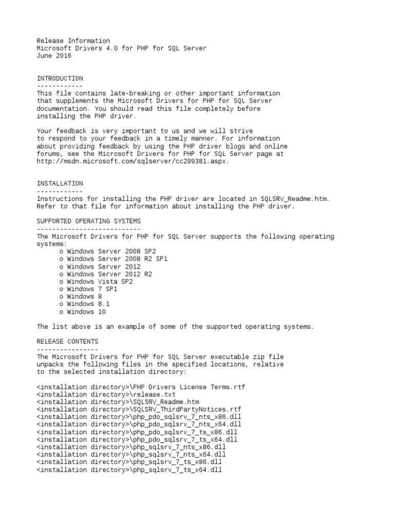 Instructions for installing the PHP driver are located in SQLSRV_Readme.htm.