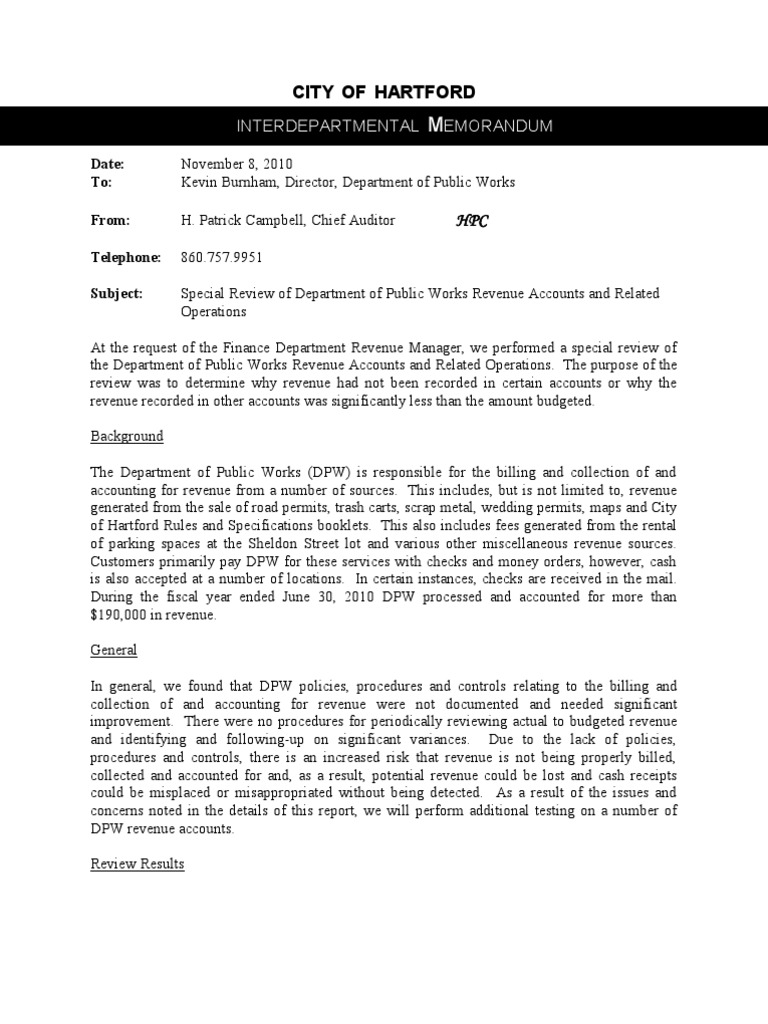 DPW is responsible for the billing and collection of and accounting for revenue from a number of sources. During the fiscal year ended June 30, 2010 DPW processed and accounted for more than $190,000 in revenue. There were no procedures for periodically reviewing actual to budgeted revenue and identifying and following-up on significant variances.