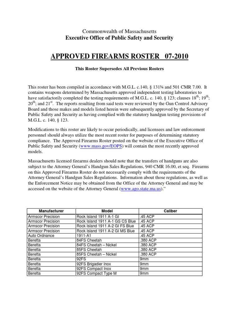 compliance. The Approved Firearms Roster posted on the website of the Executive Office of