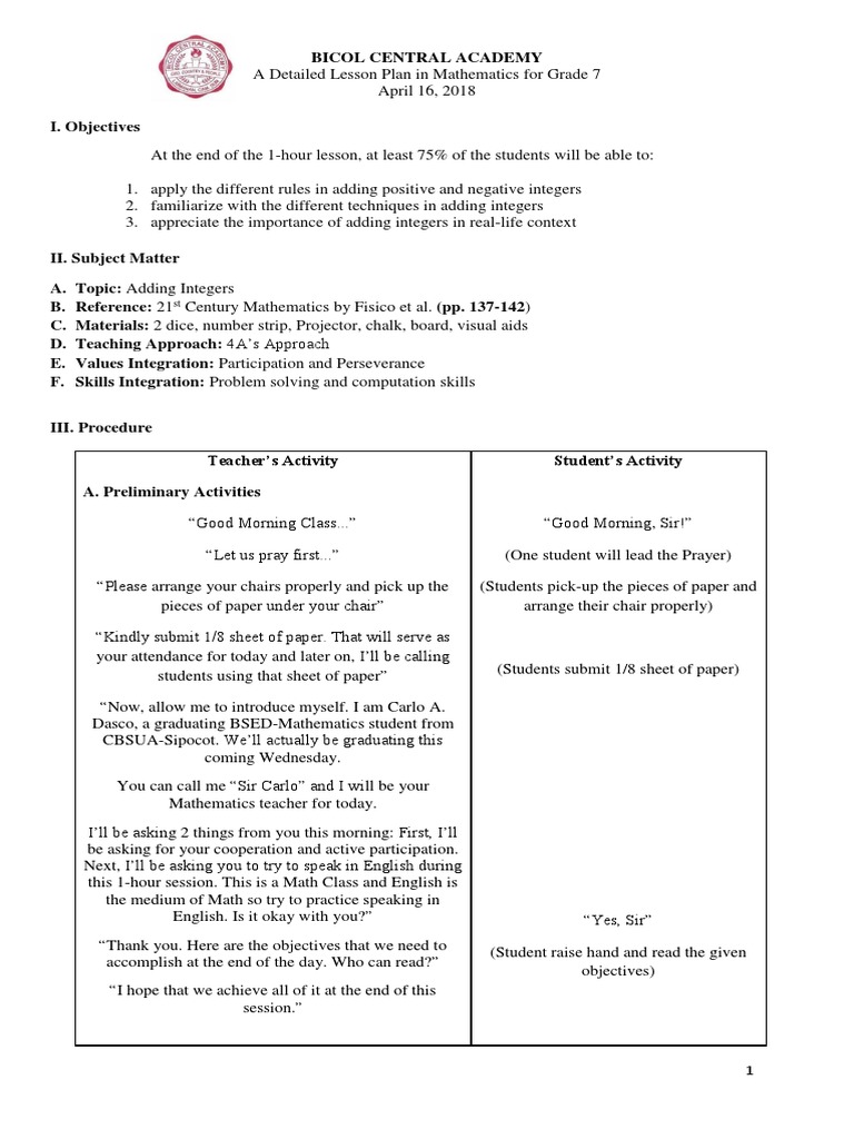 A Detailed Lesson Plan in Mathematics for Grade 7