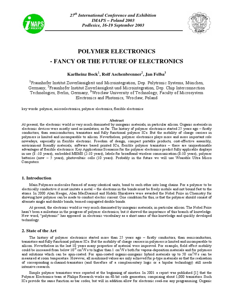 expected integrated circuits made all, or nearly all, from plastics in the future. The use of polymer electronics is opening up
