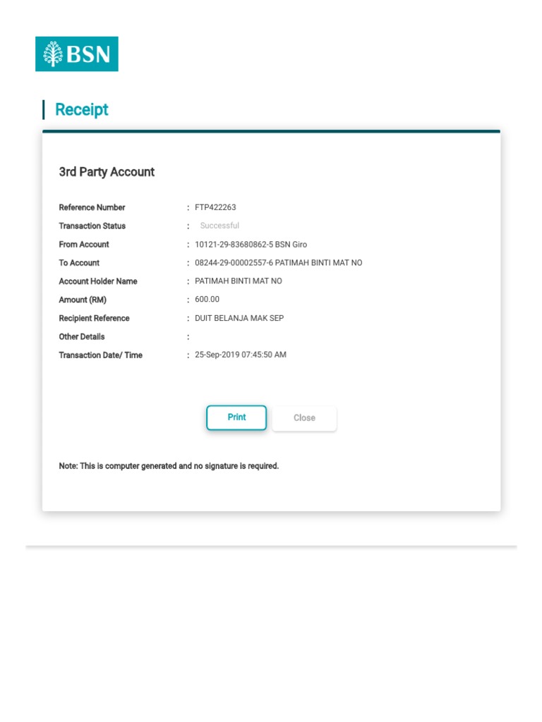 A receipt shows a successful funds transfer of RM600 from account 10121-29-83680862-5 to account 08244-29-00002557-6 held by Patimah binti Mat No on September 25, 2019 at 7:45 AM for the recipient reference of "Duit Belanja Mak Sep".