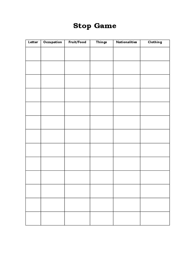 This document provides answers to a stop game, listing occupations, fruits/foods, things, and nationalities for each letter of the alphabet. It includes 26 items for letters A through Z such as architect for A, apple pie for fruit, American for nationality, and avocado for food.
