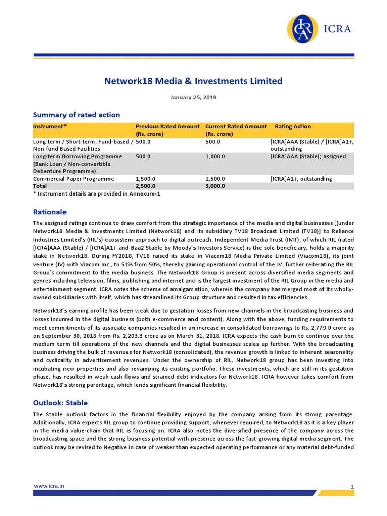 Strong parentage of Network18 - ICRA derives strong comfort from the parentage of Network18. IMT, of which RIL is the