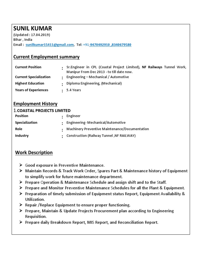 Current Position : Sr.Engineer in CPL (Coastal Project Limited), NF Railways Tunnel Work,