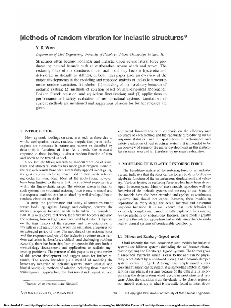 25. Kwok, Y H, Ang, A-H S, and Wen, Y K, Seismic damage analysis and 45. Wen, Y K, Method for random vibration of hysteretic systems, J Eng