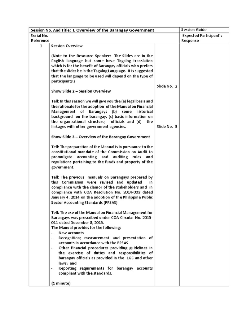 Session No. And Title: I. Overview of the Barangay Government Session Guide