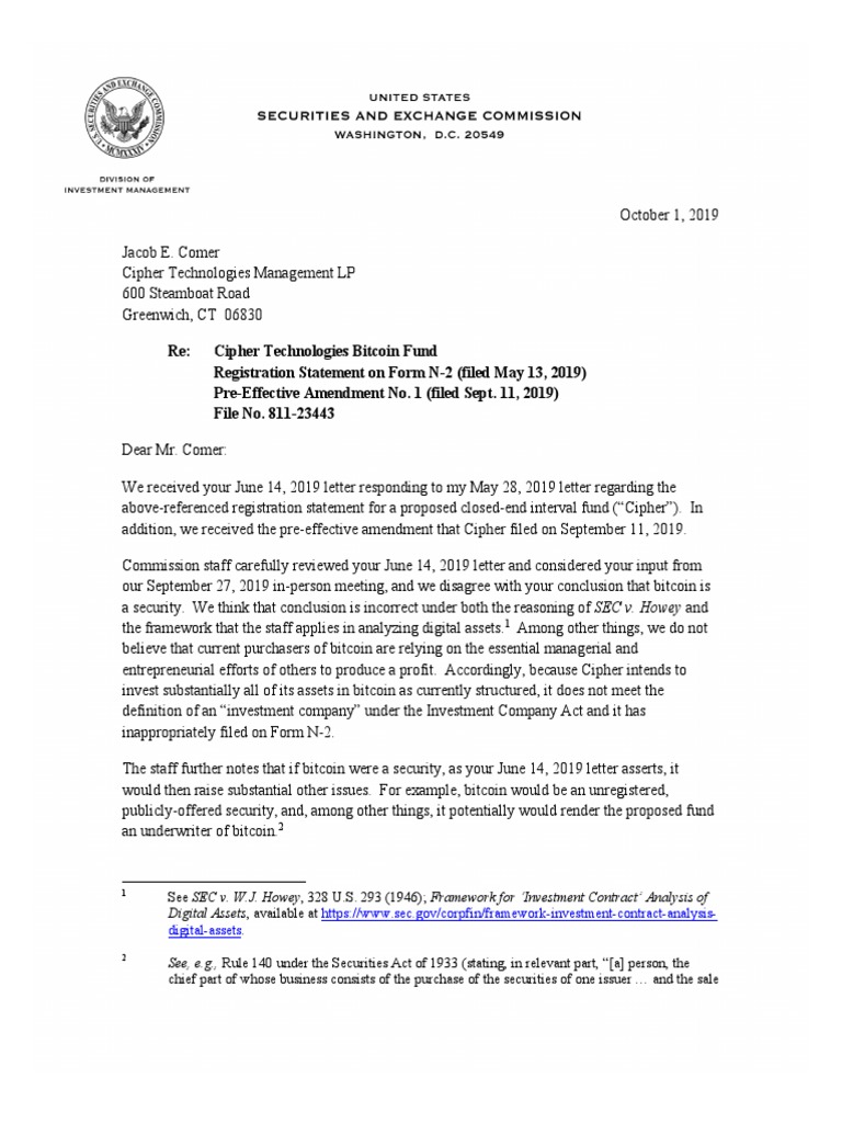 manipulation in the bitcoin market.3 The staff expects that Cipher, and funds seeking to invest