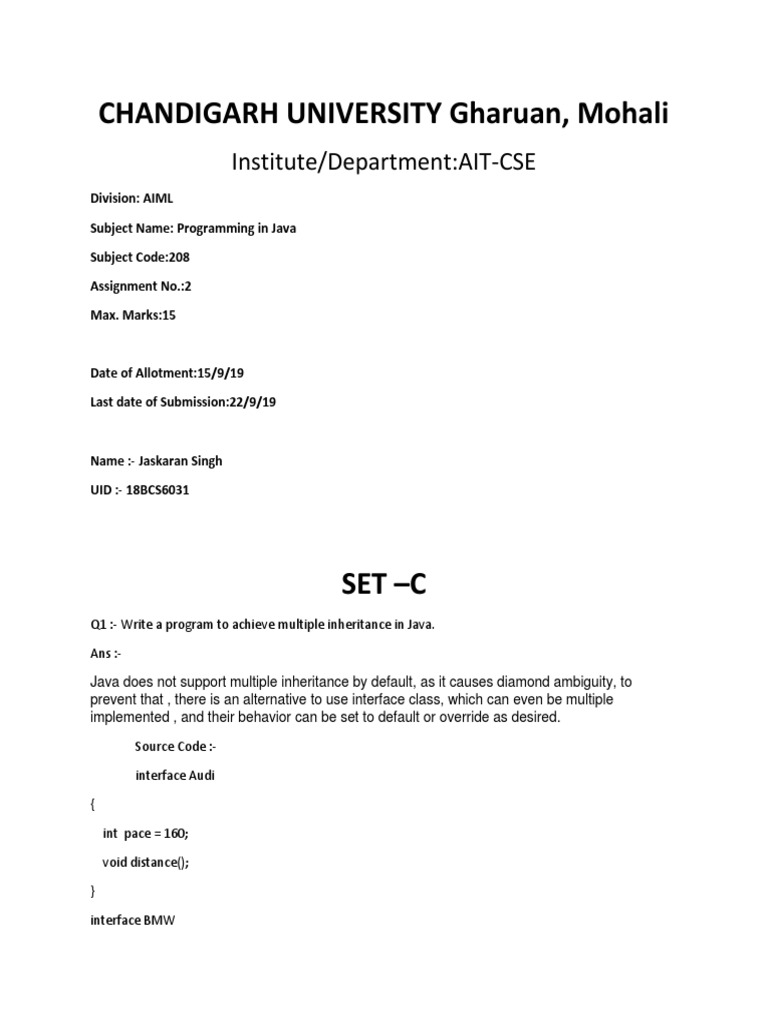 Q1 :- Write a program to achieve multiple inheritance in Java.