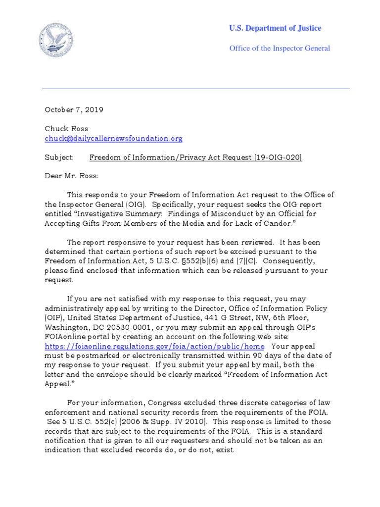 The U.S. Department of Justice Office of the Inspector General responded to a Freedom of Information Act request about an investigative report into misconduct by an official. Some portions of the report were redacted under FOIA exemptions. The response provided information on appealing the redactions and contacting the FOIA public liaison or Office of Government Information Services for assistance.