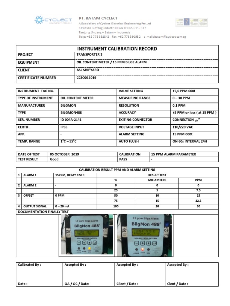 DATE OF TEST 05 OCTOBER 2019 CALIBRATION 15 PPM ALARM PARAMETER