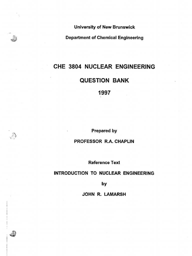 Che 3804 Nuclear Engineering Question Bank: University of New Brunswick Department of Chemical Engineering