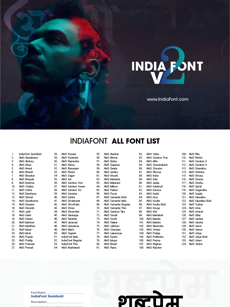 1. IndiaFont SemiBold 28. AMS Prasad 55. AMS Alankar 82. AMS Yukta 109. AMS Ritu