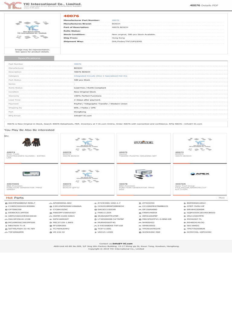40076 is New Original in Stock, Search 40076 Datasheets, PDF, Inventory at Y-IC.com Online, Order 40076 with warrantied and confidence. RFQ 40076 : Info@Y-IC.com