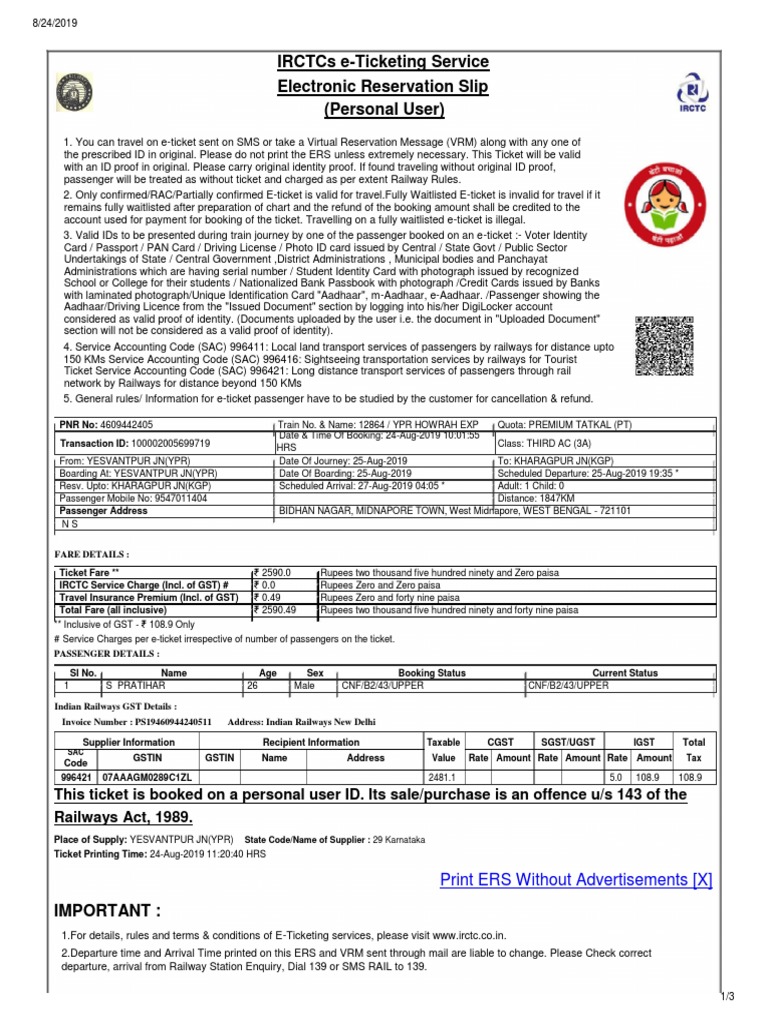 PNR No: 4609442405 Train No. & Name: 12864 / YPR HOWRAH EXP Quota: PREMIUM TATKAL (PT)