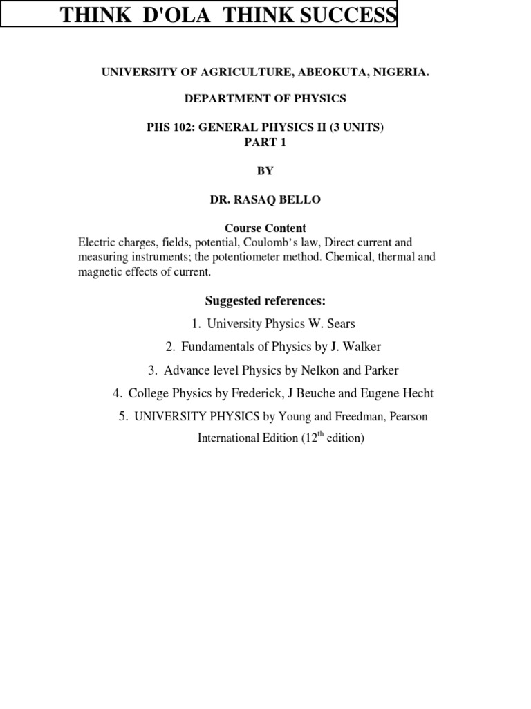 PHS 102: GENERAL PHYSICS II (3 UNITS)