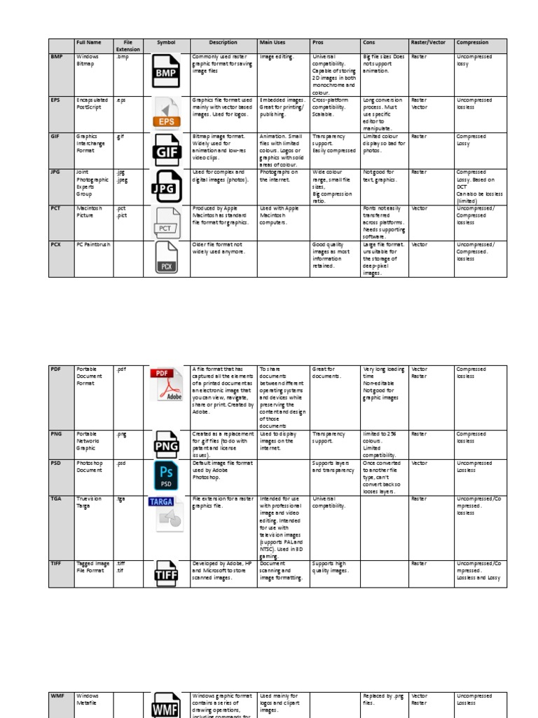 Full Name File Symbol Description Main Uses Pros Cons Raster/Vector Compression