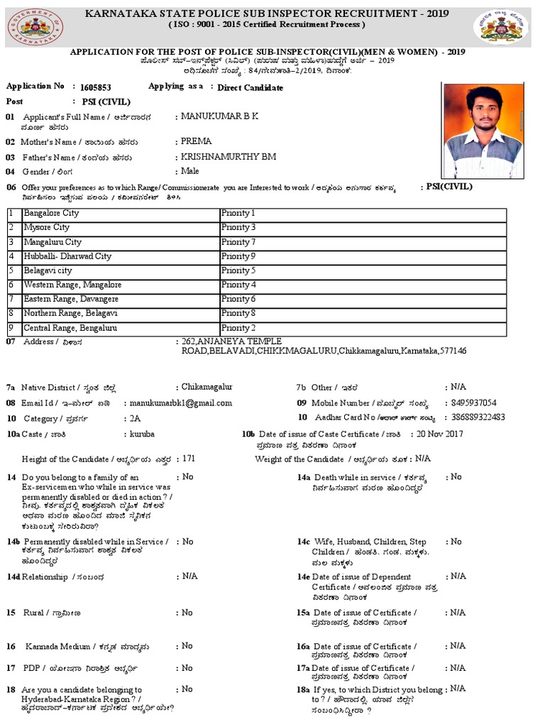 Height of the Candidate / C¨sÀåyðAiÀÄ JvÀÛgÀ : 171 Weight of the Candidate / C¨sÀåyðAiÀÄ vÀÆPÀ : N/A