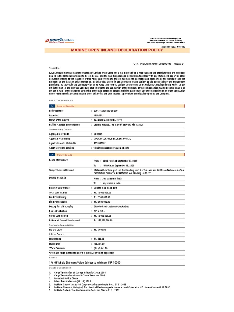 ICICI Lombard Marine Inland Policy Details
