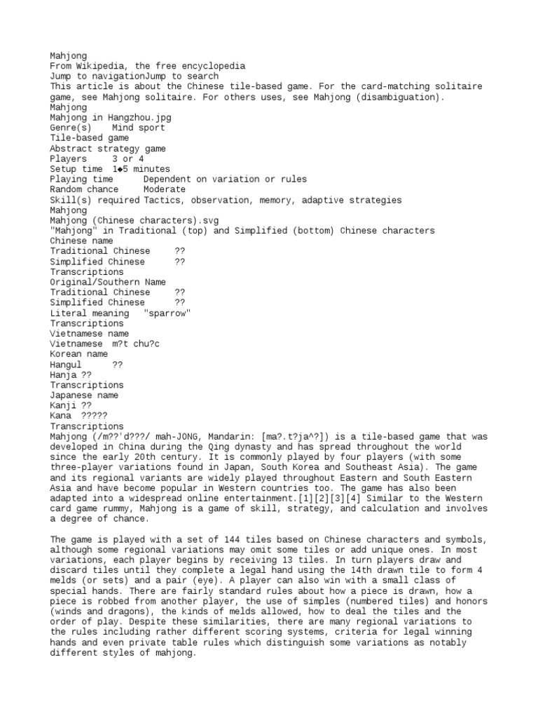 The game is played with a set of 144 tiles based on Chinese characters and symbols,