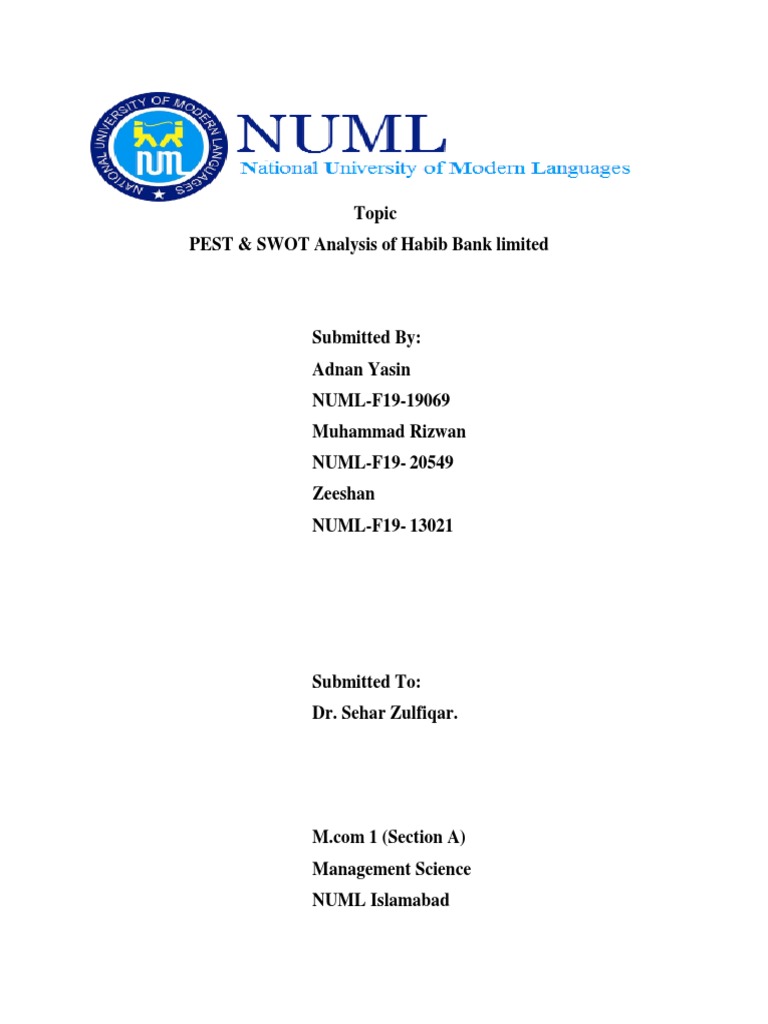 This document analyzes the PEST (Political, Economic, Social, Technological) factors and SWOT (Strengths, Weaknesses, Opportunities, Threats) of Habib Bank Limited. It was submitted by three students - Adnan Yasin, Muhammad Rizwan, and Zeeshan - to their professor Dr. Sehar Zulfiqar for a management science course at the National University of Modern Languages in Islamabad.