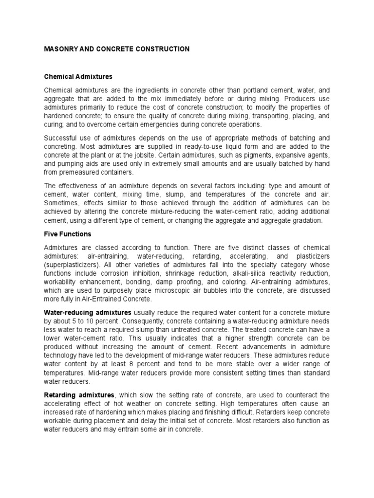 admixtures: air-entraining, water-reducing, retarding, accelerating, and plasticizers