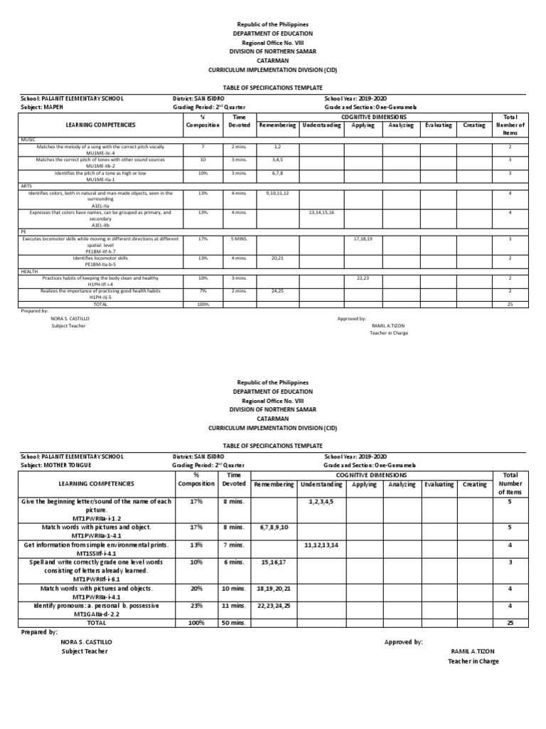 Subject: MOTHER TONGUE Grading Period: 2nd Quarter Grade and Section: One-Gumamela