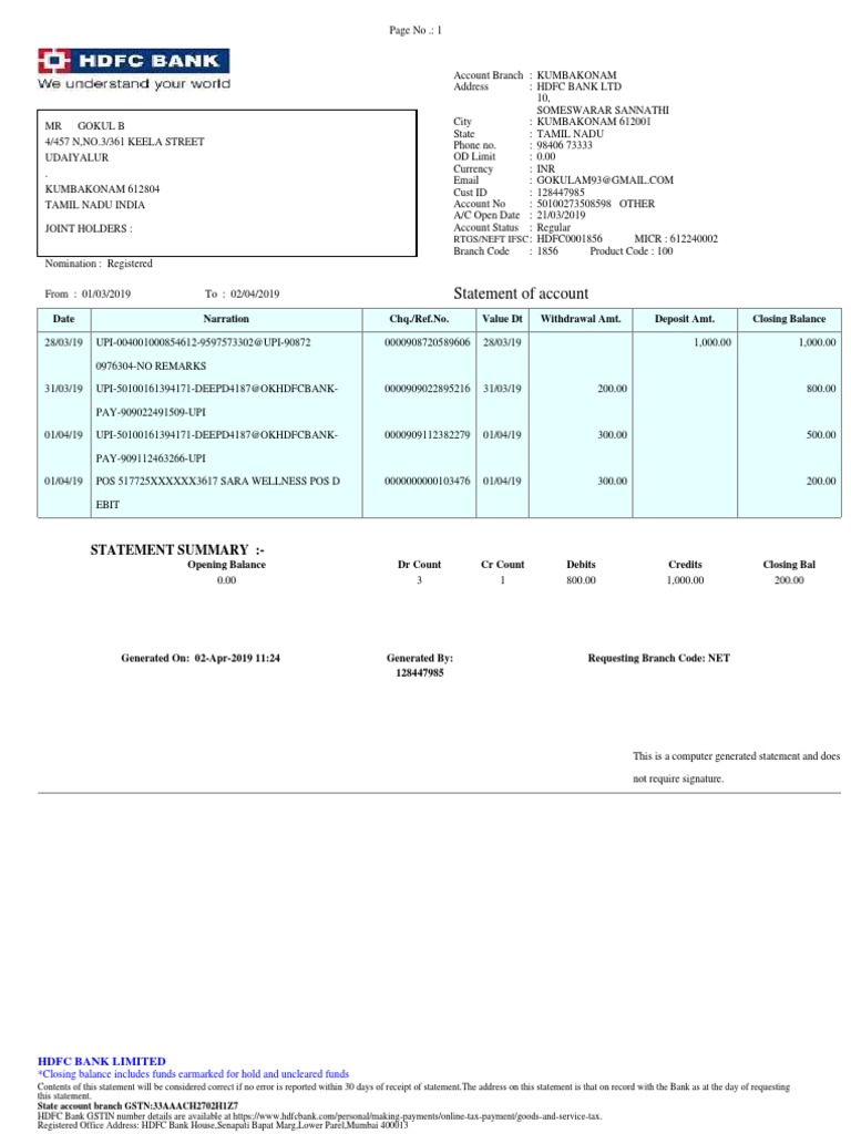31/03/19 UPI-50100161394171-DEEPD4187@OKHDFCBANK- 0000909022895216 31/03/19 200.00 800.00