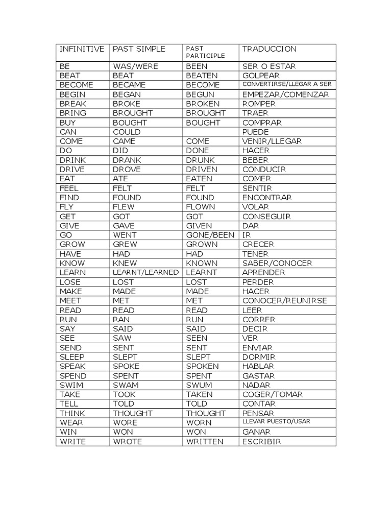 INFINITIVE PAST SIMPLE PAST TRADUCCION
