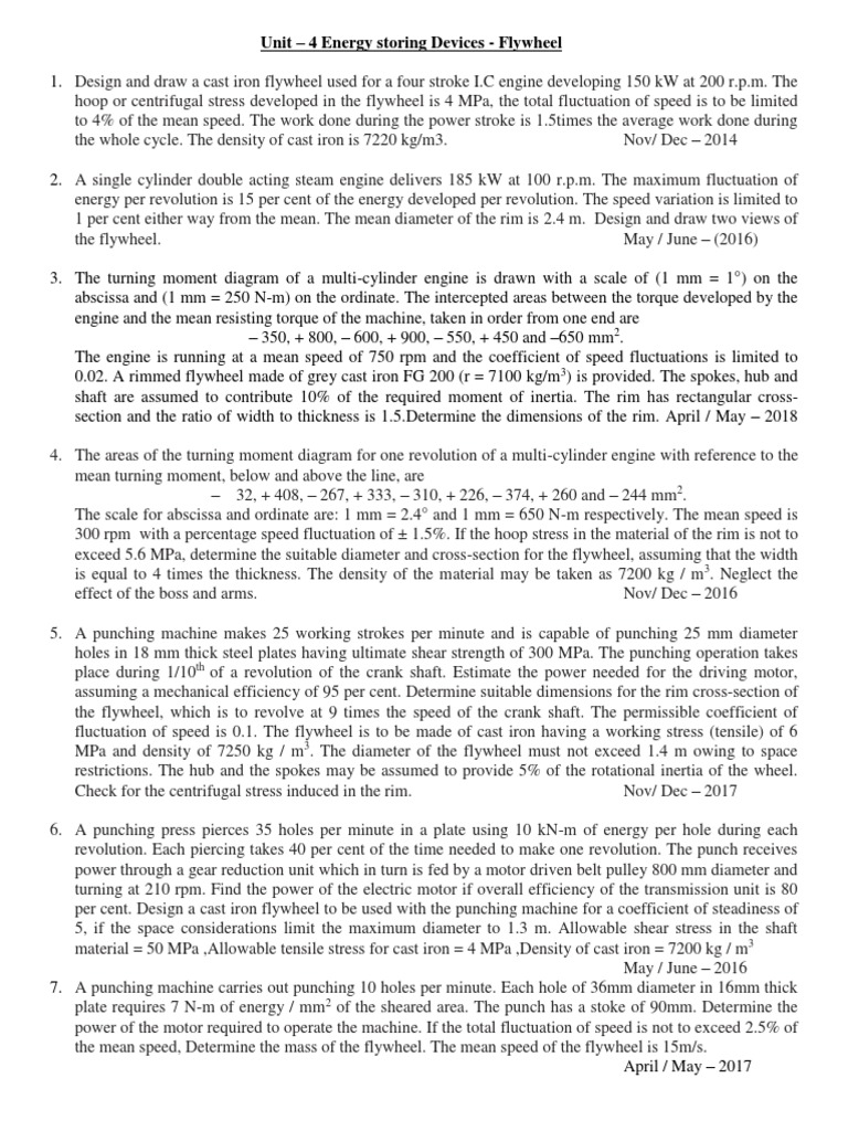 1. Design and draw a cast iron flywheel used for a four stroke I.C engine developing 150 kW at 200 r.p.m. The