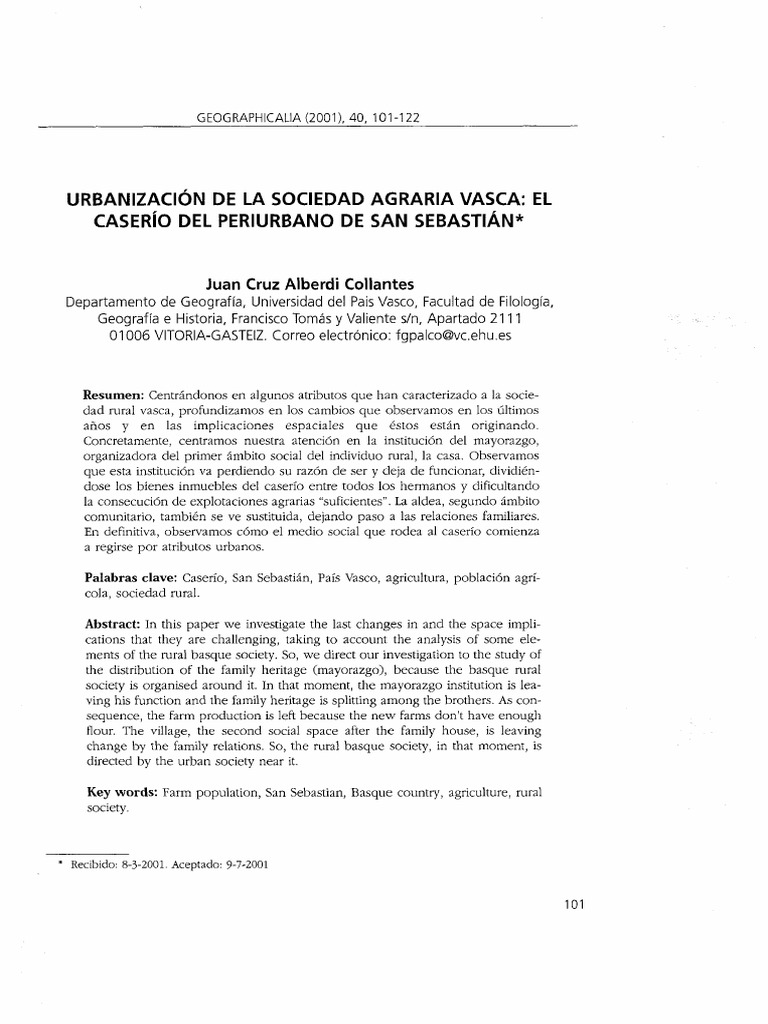 Urbanización de la sociedad agraria vasca: el caserío del periurbano ... Geographicalia, 40, 2001: 101-122