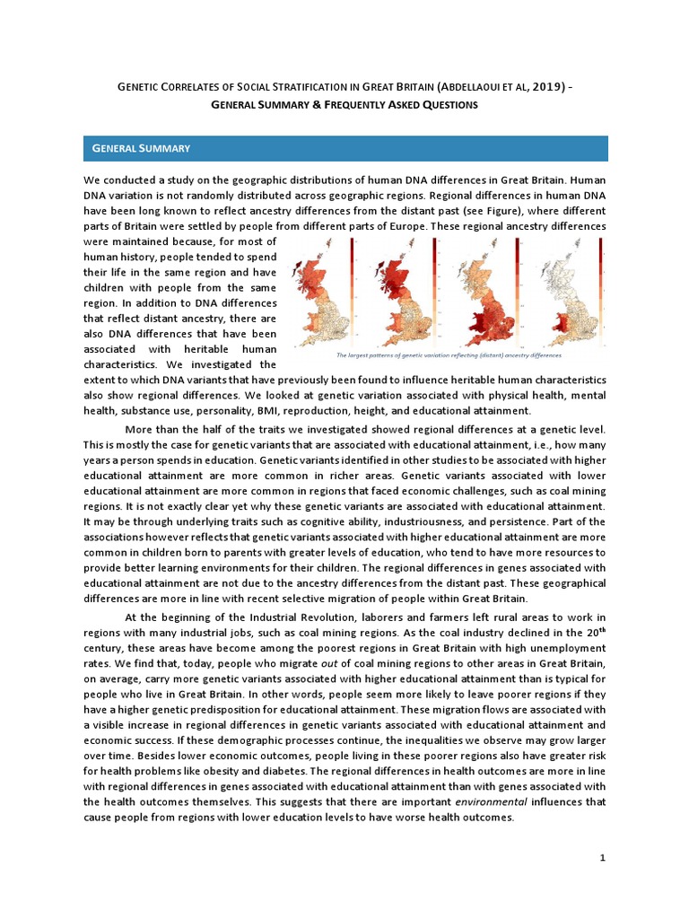 We conducted a study on the geographic distributions of human DNA differences in Great Britain. Human DNA variation is not randomly distributed across geographic regions. Regional differences in human DNA have been long known to reflect ancestry differences from the distant past (see Figure), where different parts of Britain were settled by people from different parts of Europe. These regional ancestry differences were maintained because, for most of human history, people tended to spend their life in the same region and have children with people from the same region. In addition to DNA differences that reflect distant ancestry, there are also DNA differences that have been associated with heritable human characteristics. We investigated the extent to which DNA variants that have previously been found to influence heritable human characteristics also show regional differences. We looked at genetic variation associated with physical health, mental health, substance use, personality, BMI, reproduction, height, and educational attainment. More than the half of the traits we investigated showed regional differences at a genetic level. This is mostly the case for genetic variants that are associated with educational attainment, i.e., how many years a person spends in education. Genetic variants identified in other studies to be associated with higher educational attainment are more common in richer areas. Genetic variants associated with lower educational attainment are more common in regions that faced economic challenges, such as coal mining regions. It is not exactly clear yet why these genetic variants are associated with educational attainment. It may be through underlying traits such as cognitive ability, industriousness, and persistence. Part of the associations however reflects that genetic variants associated with higher educational attainment are more common in children born to parents with greater levels of education, who tend to have more resources to provide better learning environments for their children. The regional differences in genes associated with educational attainment are not due to the ancestry differences from the distant past. These geographical differences are more in line with recent selective migration of people within Great Britain. At the beginning of the Industrial Revolution, laborers and farmers left rural areas to work in regions with many industrial jobs, such as coal mining regions. As the coal industry declined in the 20